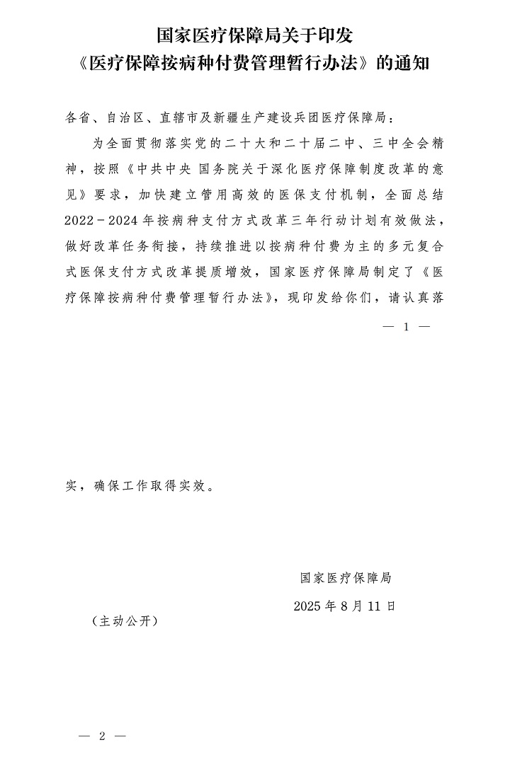 國(guó)家醫(yī)療保障局關(guān)于印發(fā)《醫(yī)療保障按病種付費(fèi)管理暫行辦法》的通知